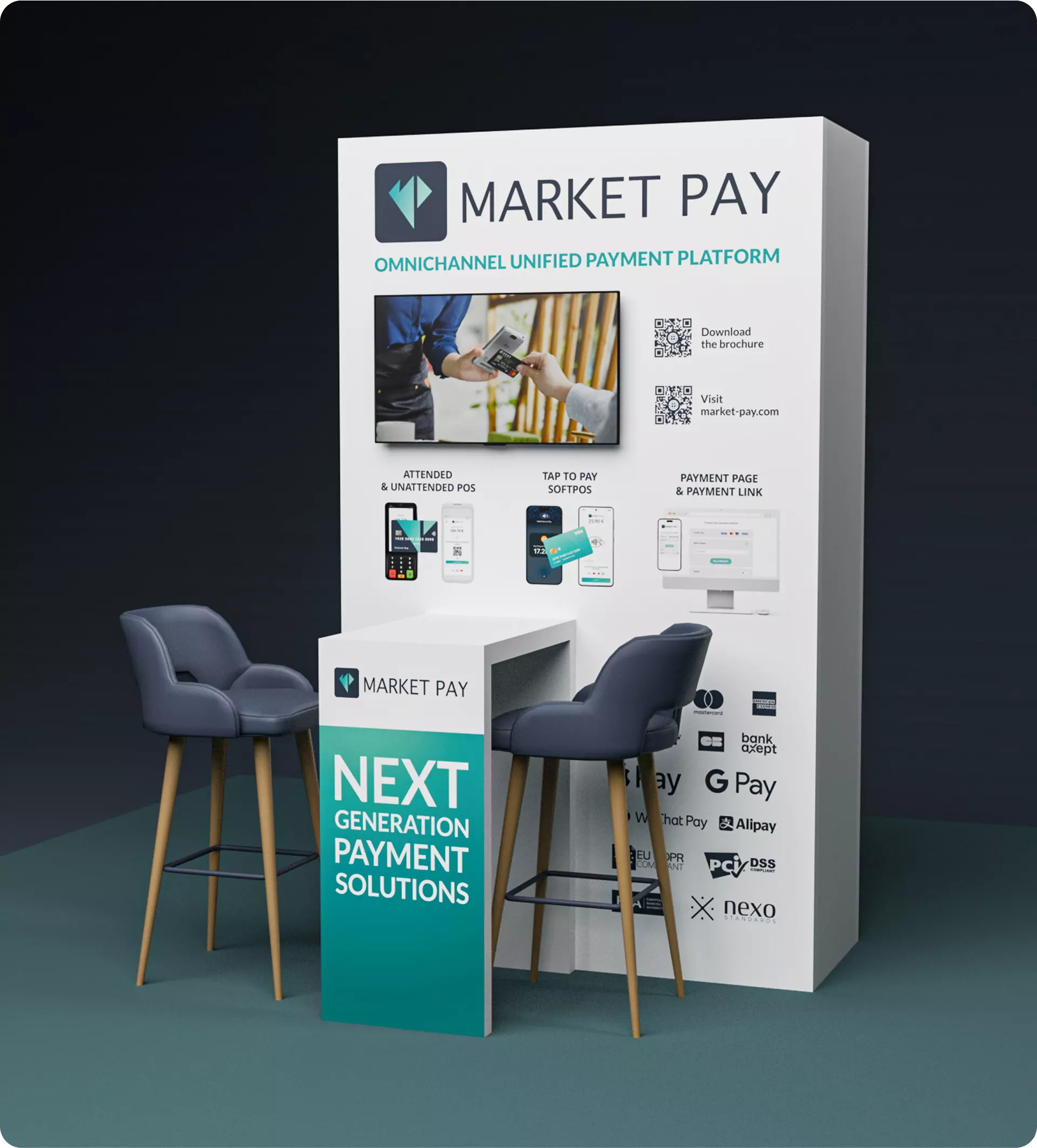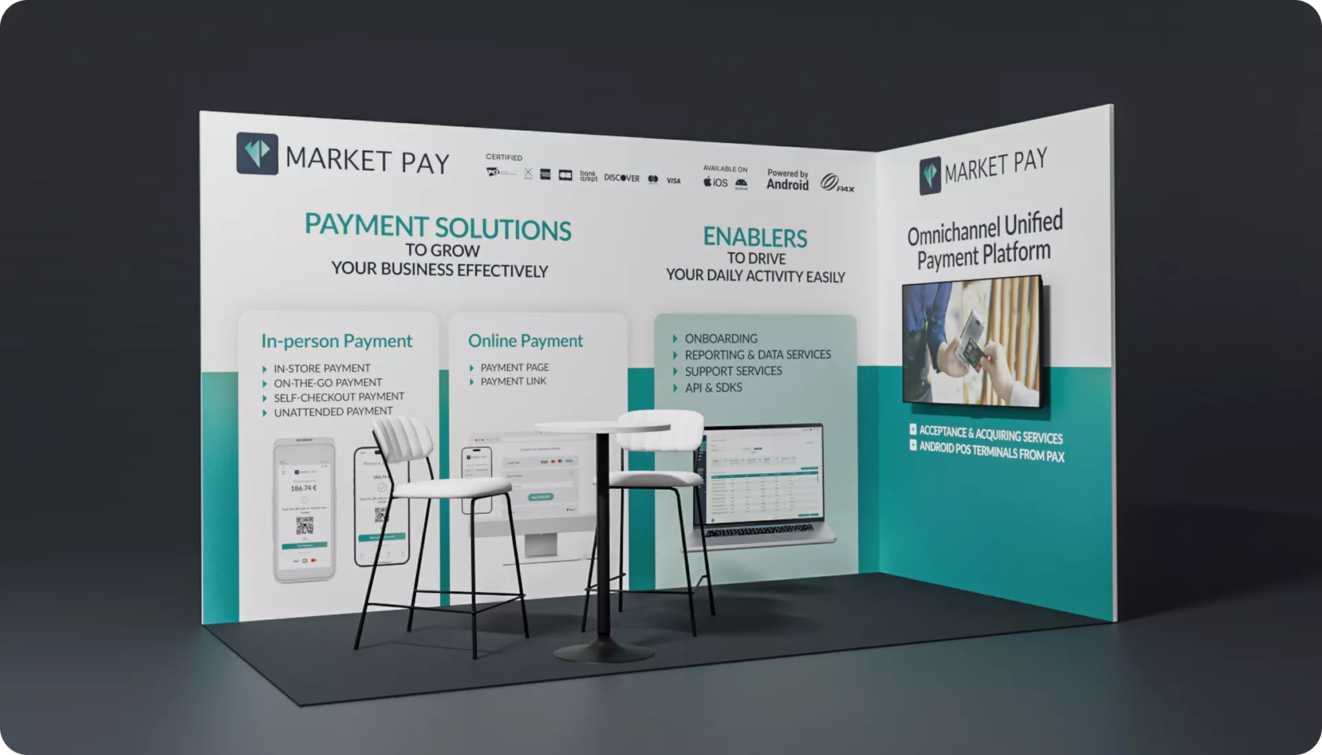 Minimal yet impactful visuals gave Market Pay a strong presence at Europe’s flagship FinTech event. A focused combination of tagline, product highlights, and partner logos created confidence and visibility within a compact setup.