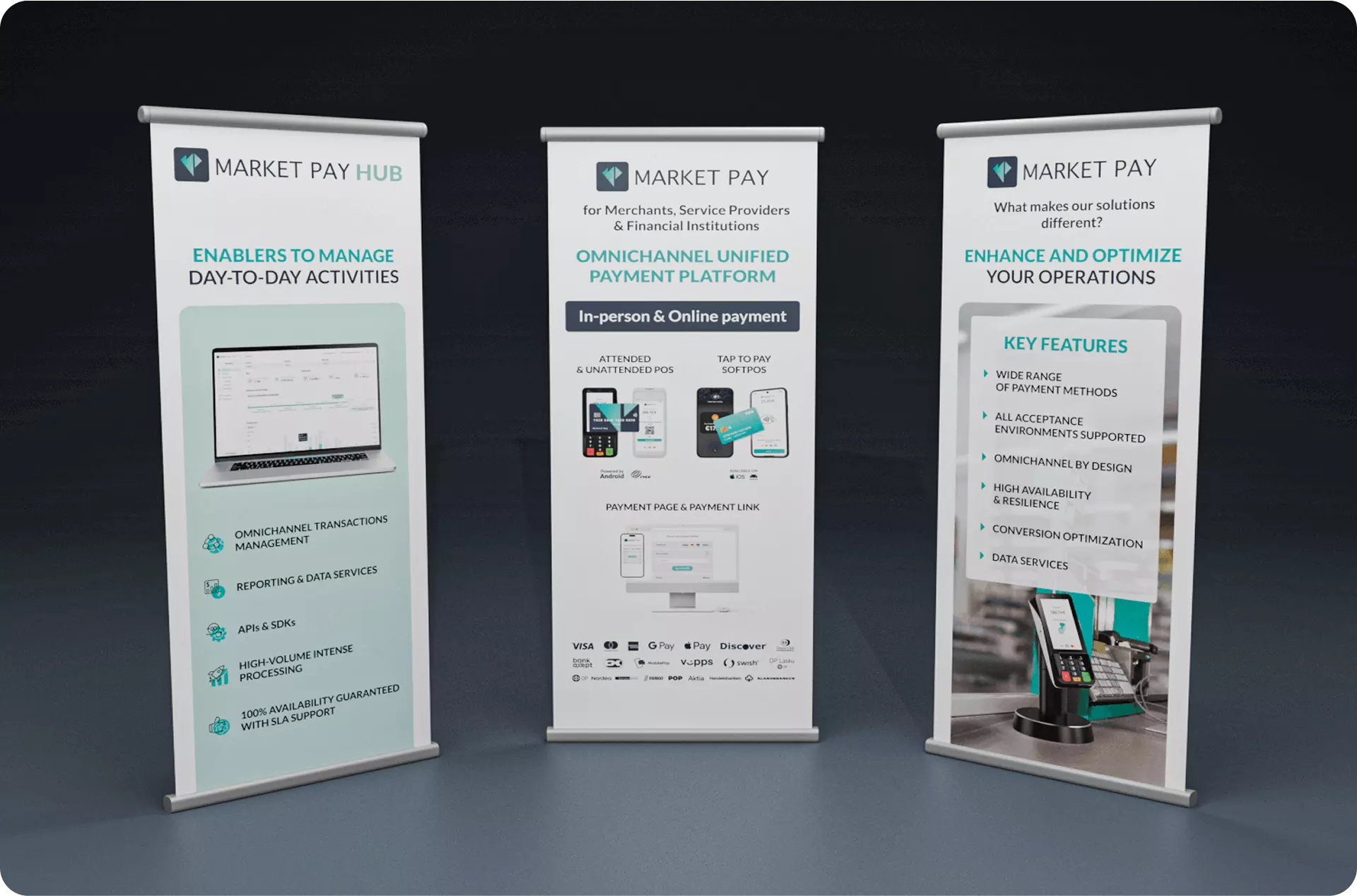 Portable roll-up banners presented different aspects of the company’s services: operations, omnichannel solutions, and key features. Concise text and consistent branding ensured readability at a glance while offering flexibility for repeated use.