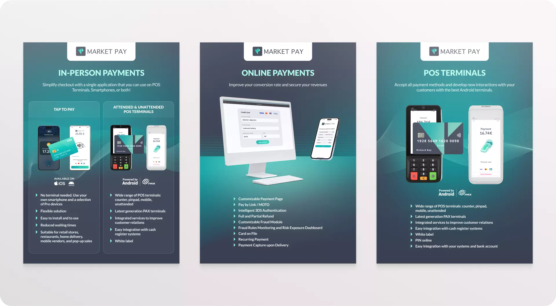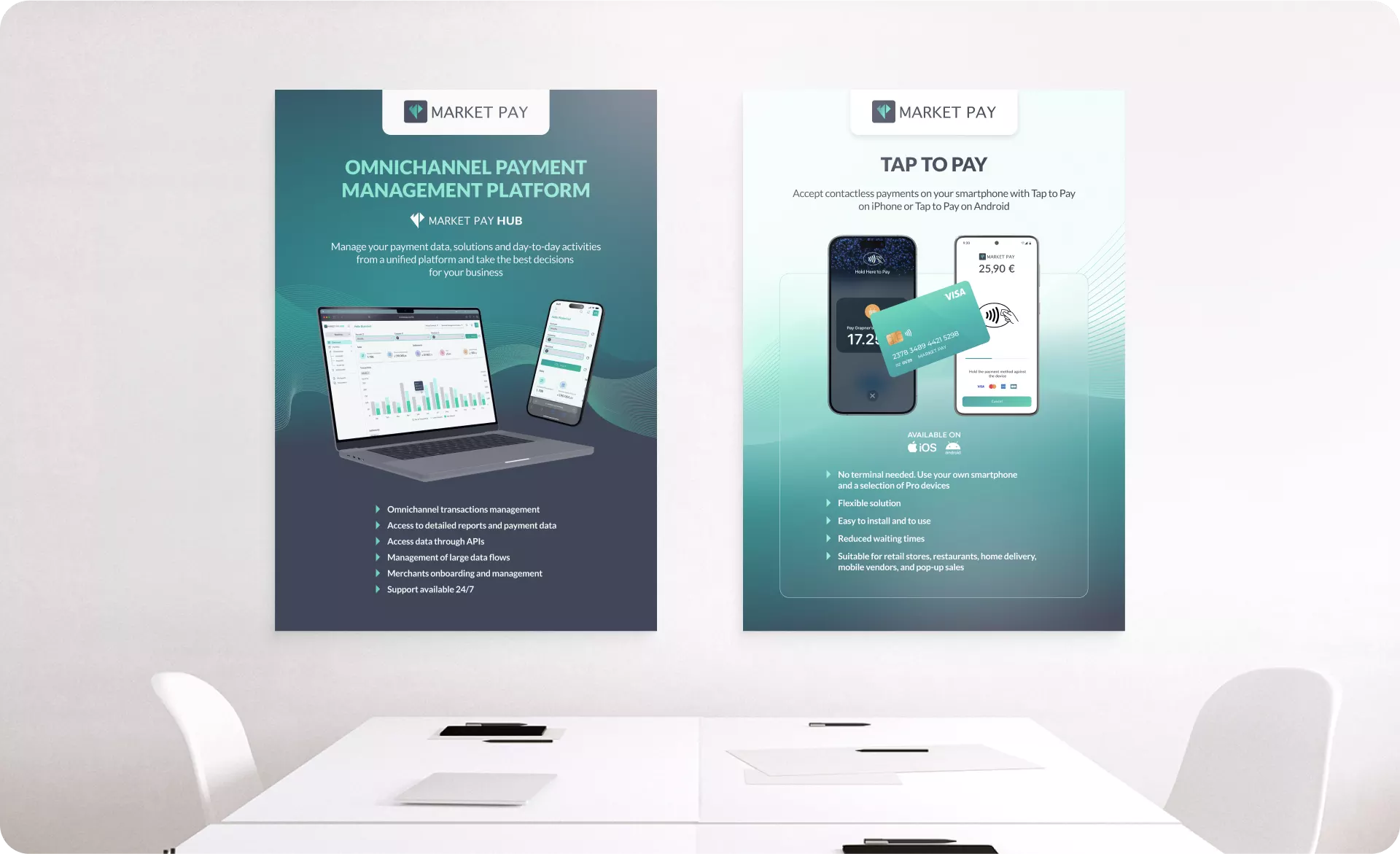 An international poster series visualized Market Pay’s portfolio across three pillars: in-person payments, online payments, and POS terminals. Designed with clarity in mind, the posters doubled as internal education tools and as a daily reminder of the company’s value proposition.