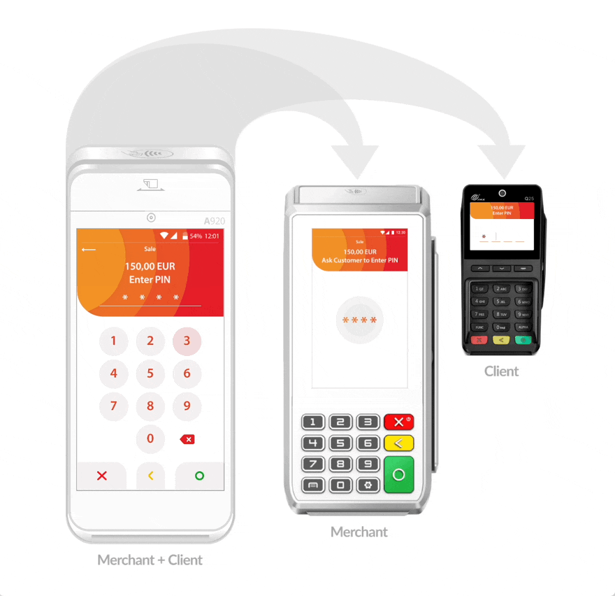 Our first interface for Polskie ePłatności has been designed with the portable terminal in mind (Andoid-based A920), the interface of which is dedicated mainly to the Merchant, but in appropriate situations is also being shown to the Customer. The A80 terminal, on the other hand, is dedicated exclusively to the Merchant, and the additional PinPad Q25 is used to display information to the Customer. This fundamental difference between the way devices were used, required a redesign of all flows that involved Customer interaction.